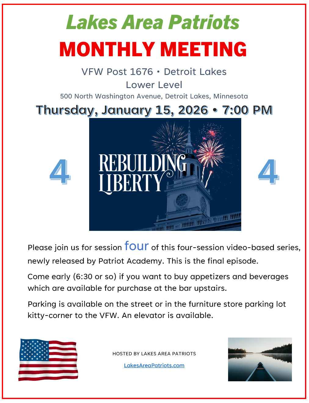 Next founders meeting is Monday, January 5th, 2026, at 5:00 pm. This will be the annual organizational meeting where we elect our officers for 2026. Any member can run for an officer position; just show up at this meeting. Location will be at the Detroit Lakes City Hall Conference Room, West Side Entrance.